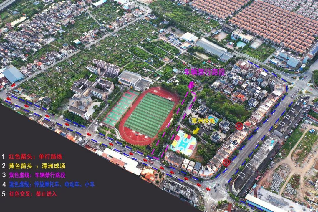 3.为避免造成拥堵,活动当天潭洲球场周边将实行交通管制,期间大鹏路段将调整为单向行驶 (详见指引图),如出现人流量较大情况将会实施临时禁行管控,届时请听从交警部门现场指挥。